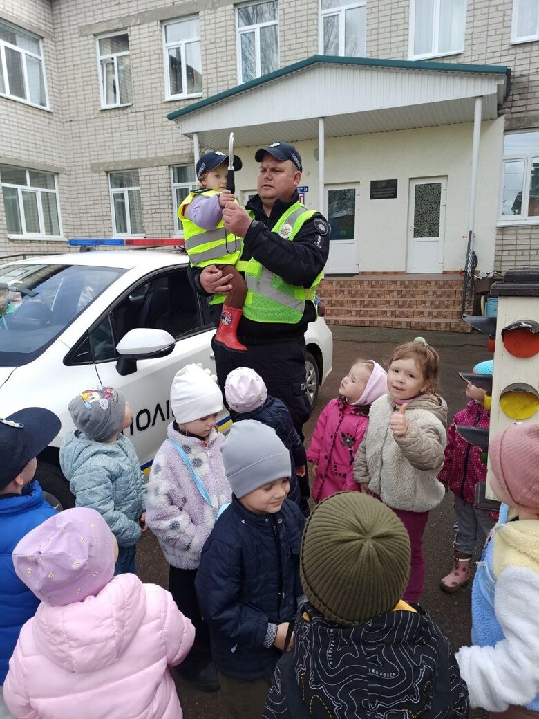 Особливо цікавим для малят стало запрошення працівників поліції до садочка. Поліцейські розповіли дітям про особливості своєї роботи, показали елементи форми, спорядження, а також справжній поліцейський автомобіль.